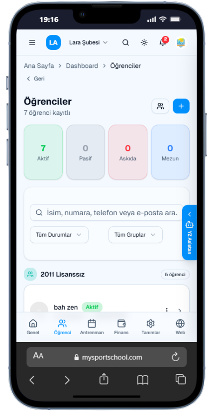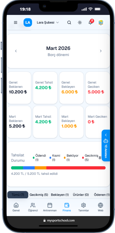Öğrenci kayıtları, aidat takibi, antrenman programları, yapay zeka asistanı ve daha fazlası. Spor okulları için tasarlanmış tam kapsamlı yönetim platformu.