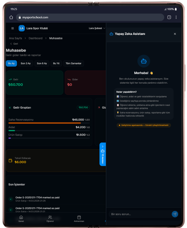 AI destekli akıllı asistan ile gelir-gider analizleri, öğrenci istatistikleri ve operasyonel sorulara anında yanıt alın.